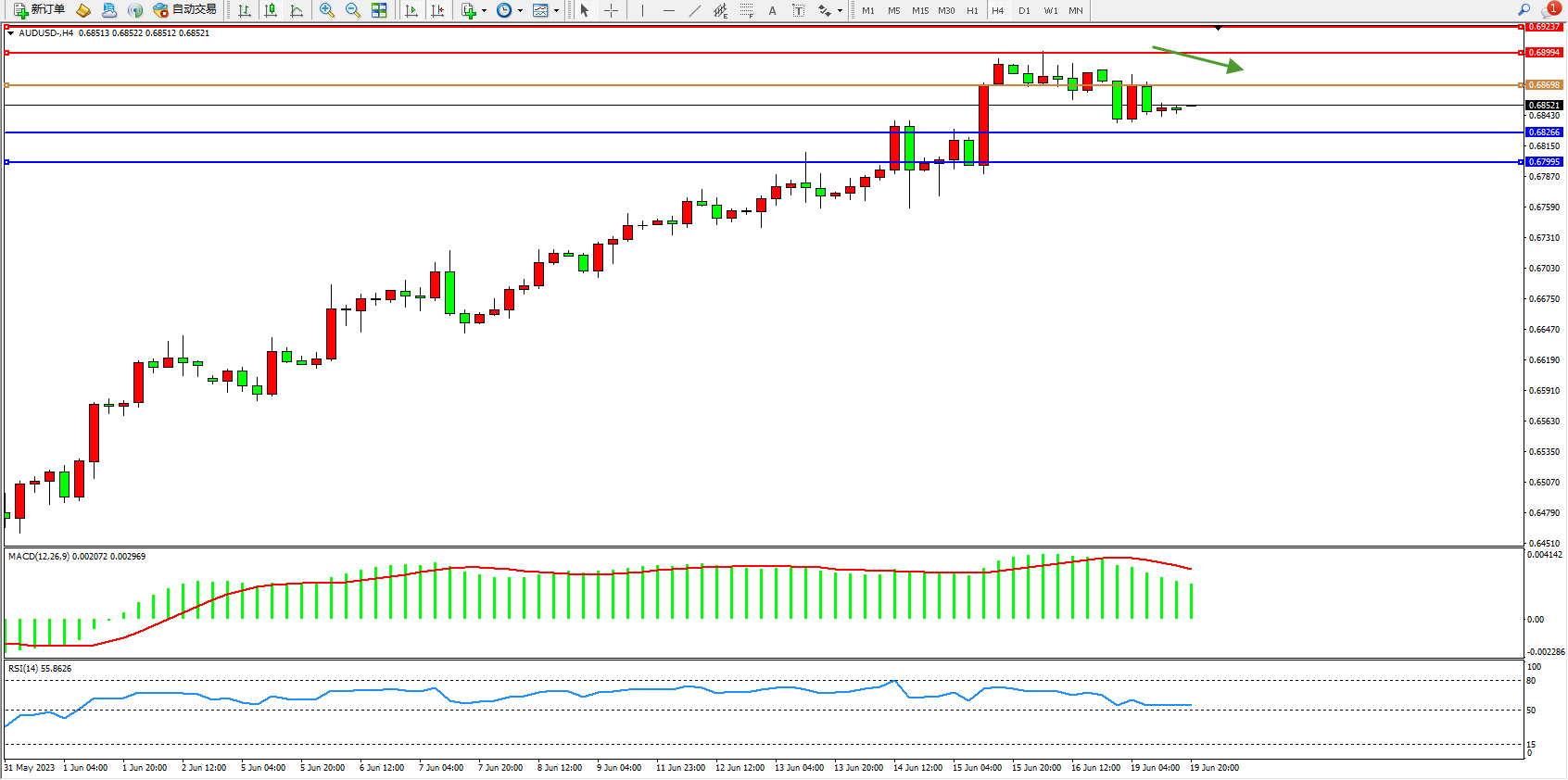澳元兑美元维持0.68521附近震荡,澳洲联储将于周二公布6月货币政策会议纪要,投资者将从中窥见澳洲联储对于进一步加息的态度;澳新银行预计澳洲联储在7月和8月在加息25基点,将峰值利率推向4.6%。