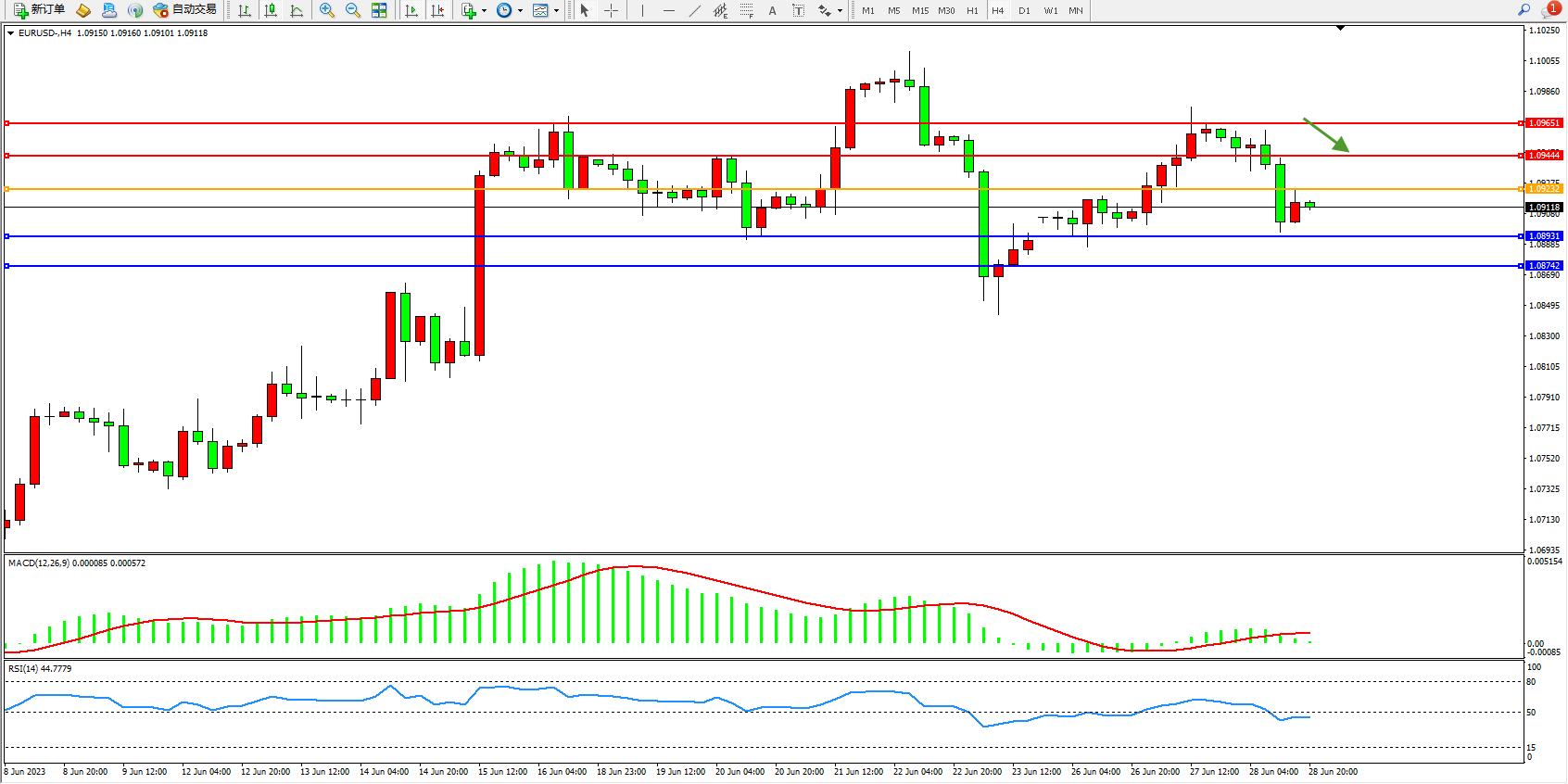 欧元美元EURUSD—4小时K线图显示: