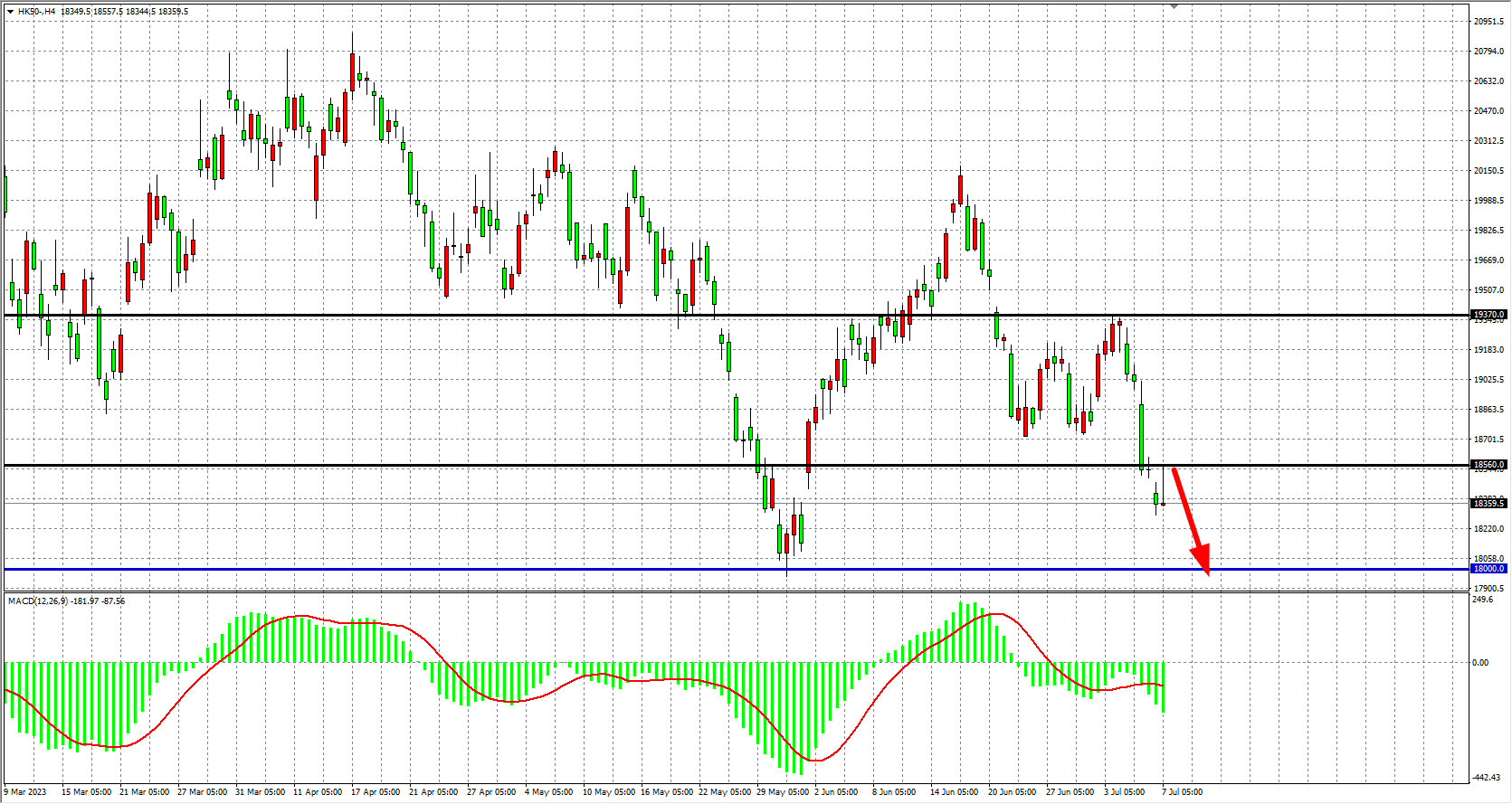 4小时图看,恒指进在18700之下进一步走低,MACD量能零轴下放量,趋势延续空头,当前阻力下移至18560附近,该位下继续看跌18000-17960。