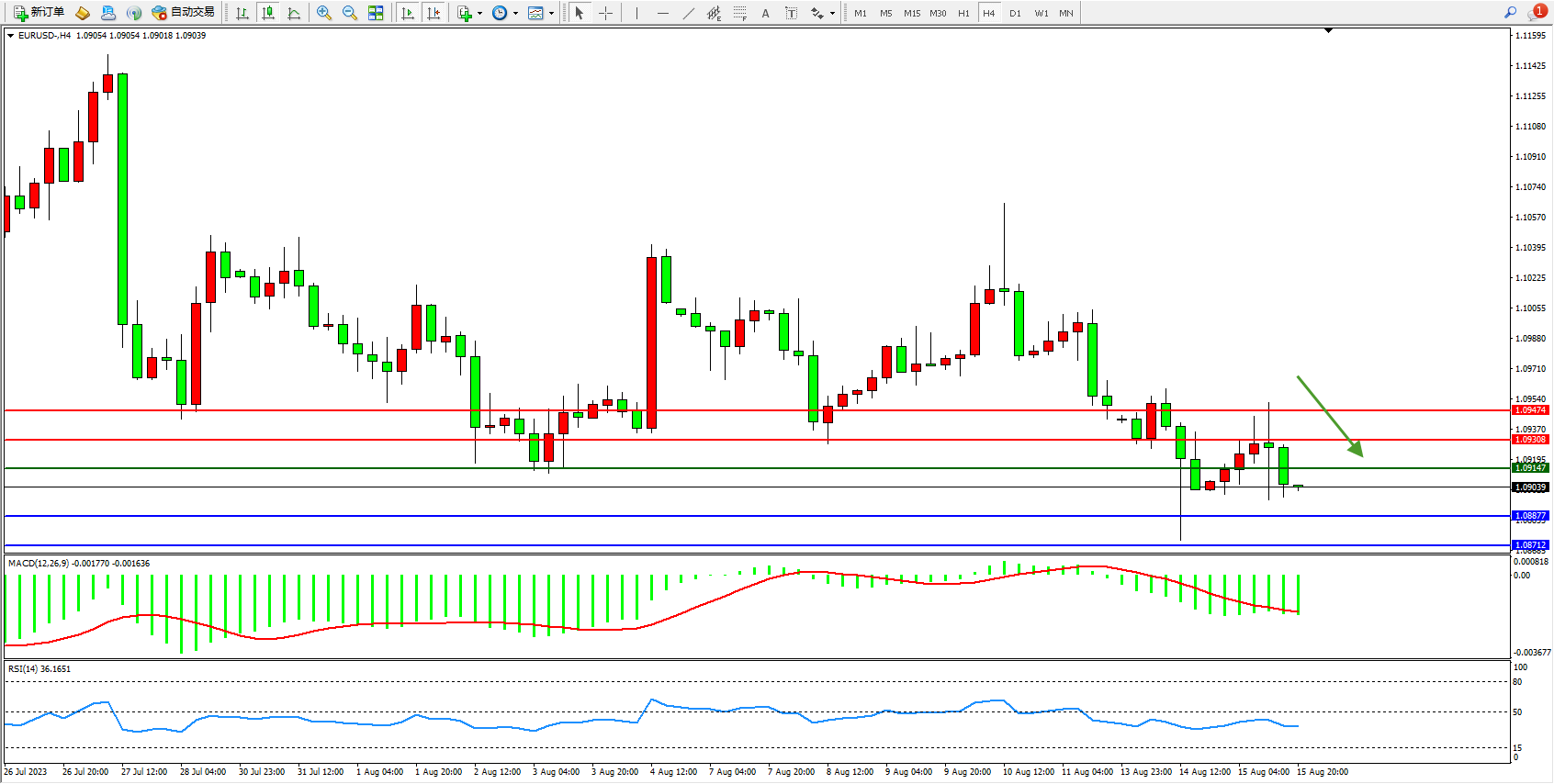 欧元美元EURUSD—4小时K线图显示:
