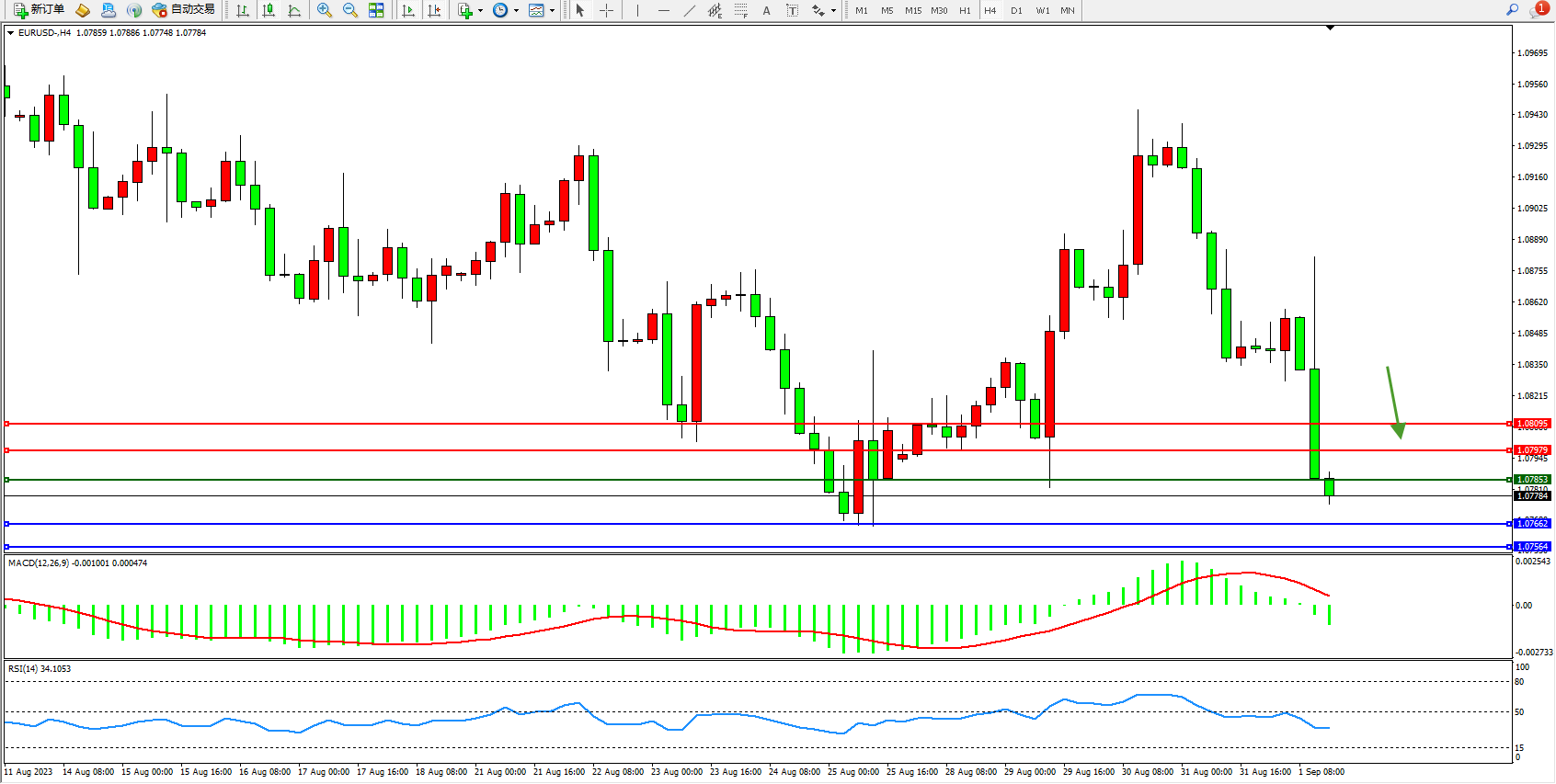 欧元美元EURUSD—4小时K线图显示: