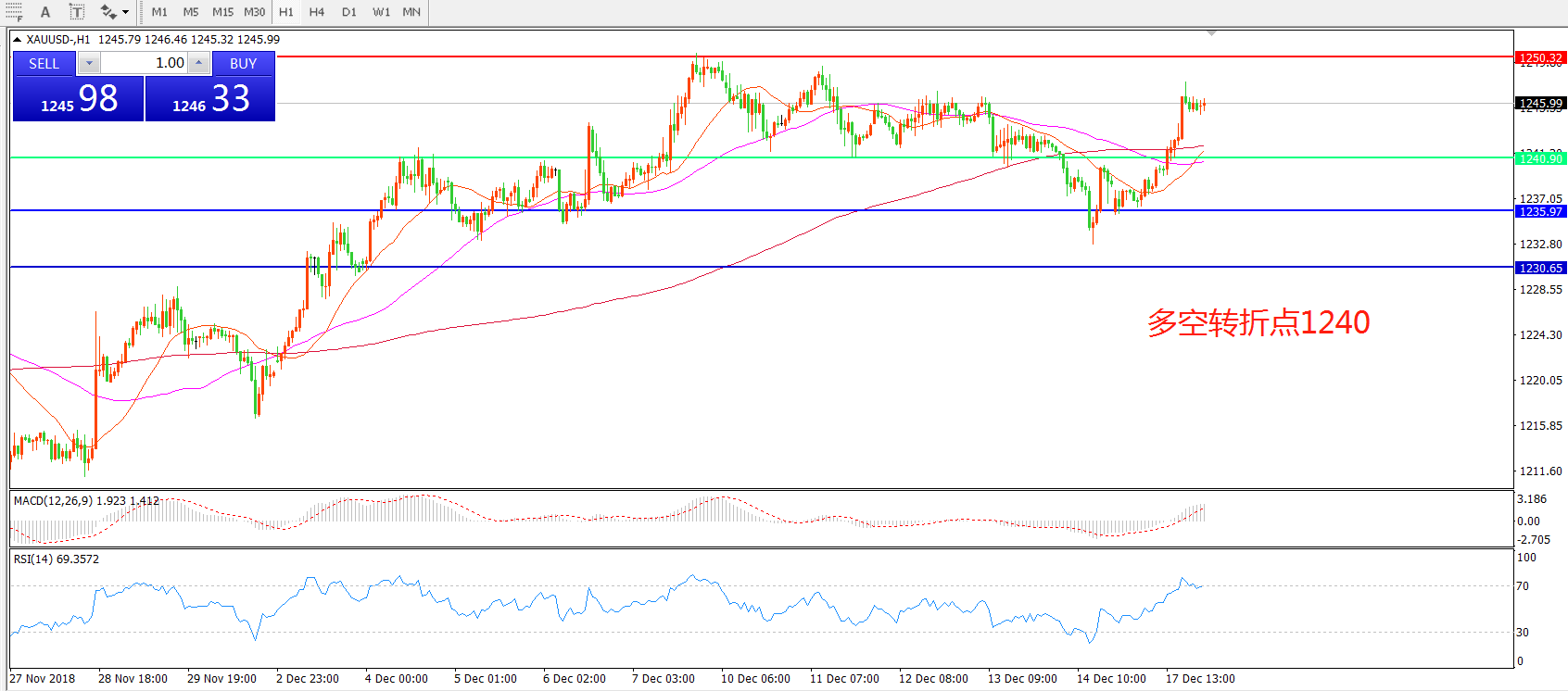 受美股暴跌引发的避险情绪推升,现货黄金周一(12月17日)收于1245.70美元/盎司,上涨7.5美元,涨幅0.61%。周一美股再现暴跌,三大指数均跌超2%,刺激了市场避险情绪的爆发,现货黄金美盘最高上探至1248.08美元,再度逼近1250美元高位,终结此前两连跌。同时美元指数回调也给黄金重启涨势提供支撑。本周重点之间频频。美联储FOMC议息会议在周二和周三召开,市场普遍预期FOMC在周三中午将宣布加息0.25%。如果美国国会和总统特朗普之间达不成协议,美国政府又面临关门风险。