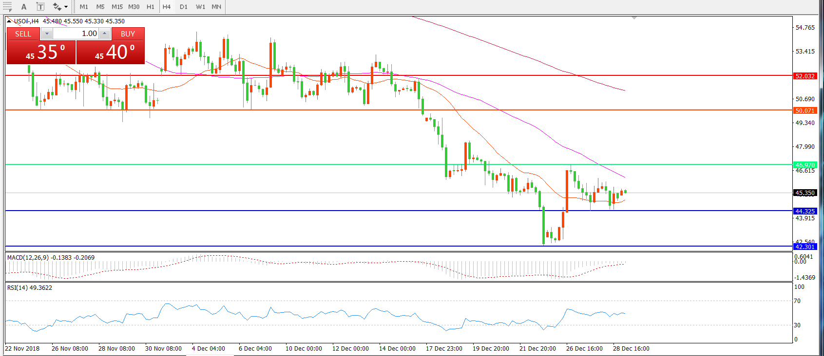 尽管上周油价有所反弹,但是从2018年全年看原油整体走势依旧疲软。美国原油年内跌幅达到22.4%。尽管OPEC已经减产,但是并没有给原油带来有效的提振。美国WTI原油周五(12月28日)收涨0.72美元,或1.61%,报45.33美元/桶,本周下跌1.1%