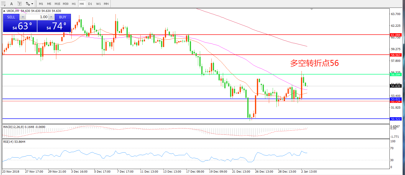 4小时图看,油价经过连续测试,初步站稳53美金一线支撑,21与55均线逐渐粘合形成支撑,MACD绿柱缩短,短期反弹成为可能,窄幅震荡的走势的概率较大。