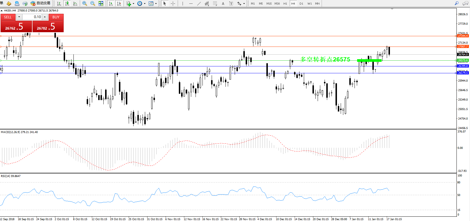 恒指HK50 ——4小时K线图显示: