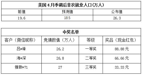 4月份非农就业人数大竞猜活动中奖结果已出,获奖信息如下: