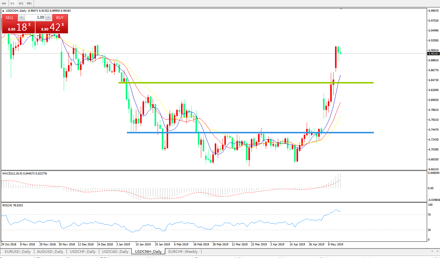 交易策略6.8450之上,看涨,目标价位为6.9200,然后为6.9400