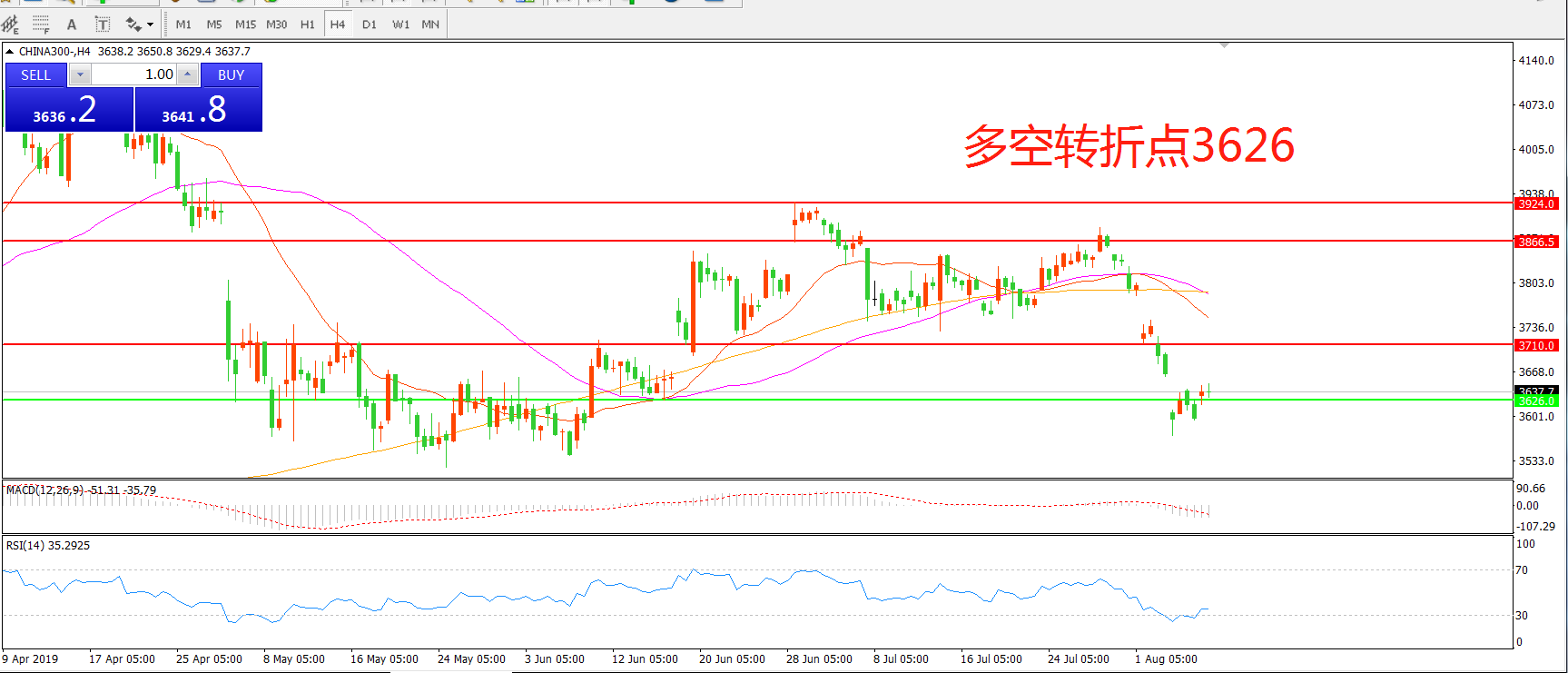 4小时图看,沪深300指数昨日高开高走 ,但反弹力度脚线,整体表现依然偏弱,均线粘合形成上方阻力,日内延续下行概率较大