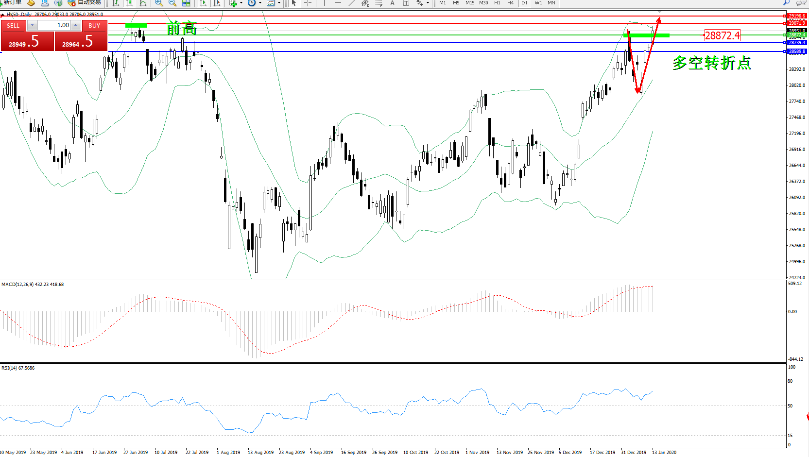 交易策略:28872上方看涨,目标29071、29196