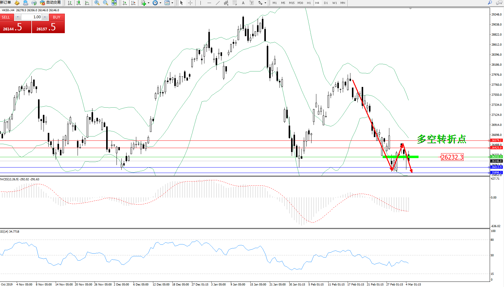 恒指HK50 ——4小时K线图显示: