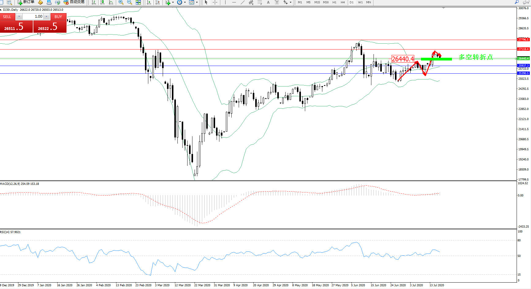 技术点评:长时间纠结于布林带指标通道内持续窄幅震荡走势中,多次试探上轨附近节点后,终究多头动力破位上扬,但后续动力略显不足,突破布林带指标上轨附近关键节点后有回撤迹象,关注26440附近转折点,布林带指标呈收口走势后有张口态势,关注上方转折点,MACD指标长时间纠结于0轴线附近弱势徘徊有上扬迹象,RSI指标处于50均衡线上方维持窄幅整理有开始有拉升上移走势;