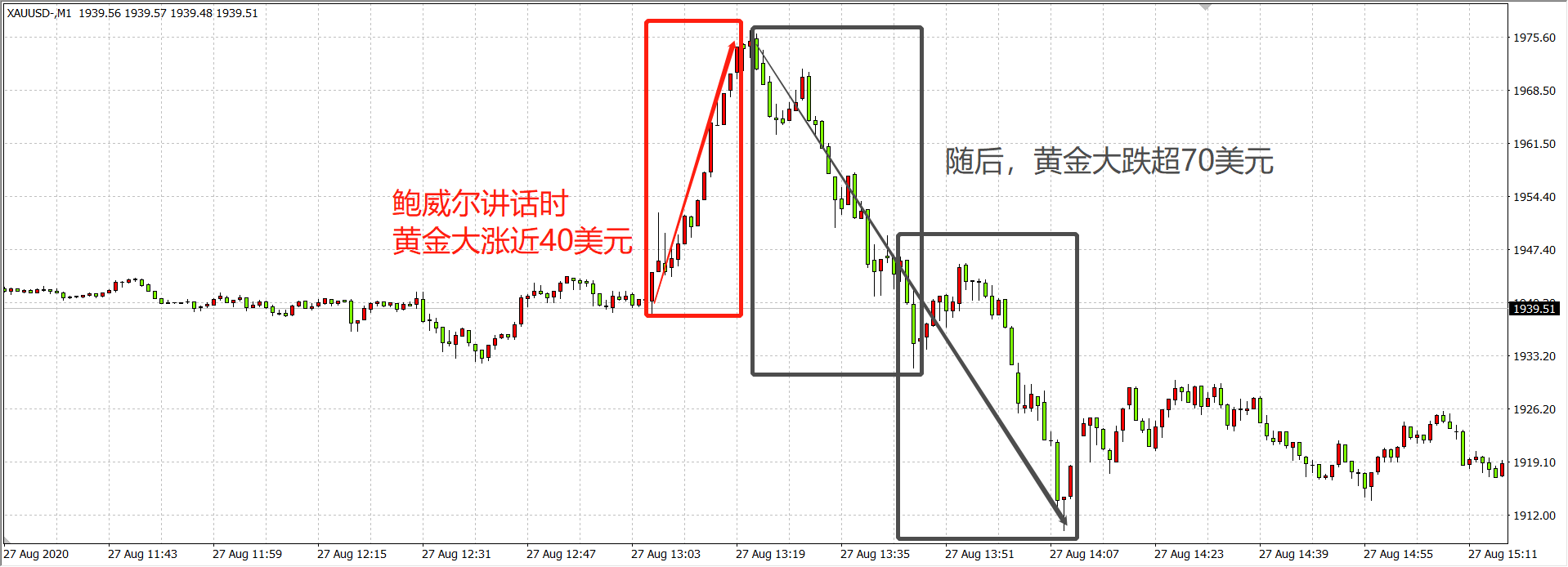 随后,市场投资者开始消化和解读鲍威尔讲话的内容实质性,由于鲍威尔并未如市场所愿宣布将通胀目标定在2.5%,只是表示美联储将允许通胀在一段时间内超过2%的目标,始终“允许”和“达成”是两码事,市场情绪因此急剧转变,美指触底反弹,黄金大跌超70美元。
