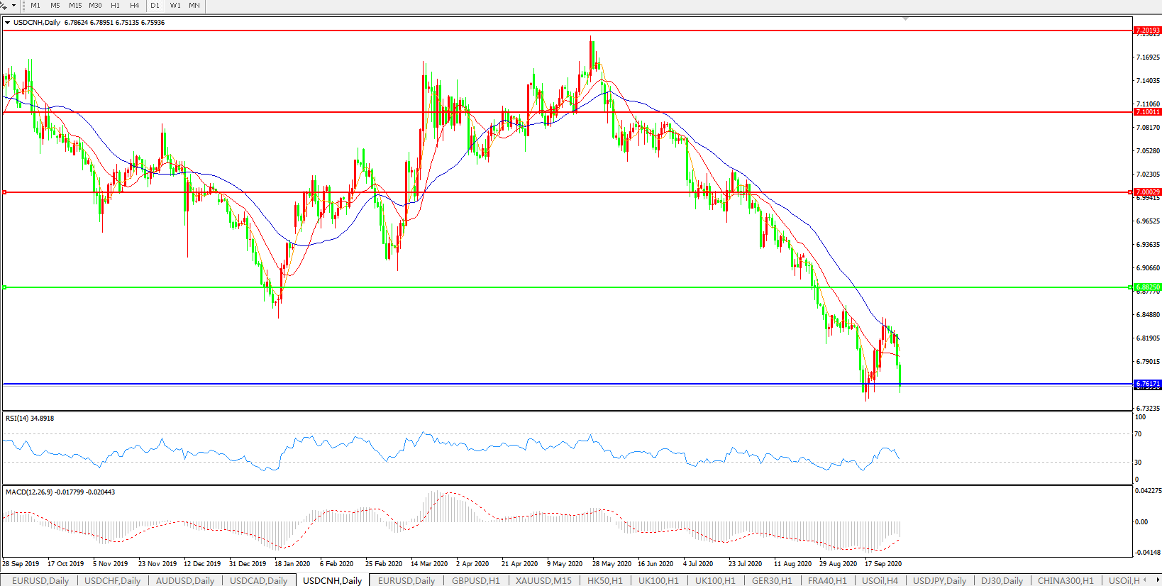 美元兑人民币USDCNH 日线图: