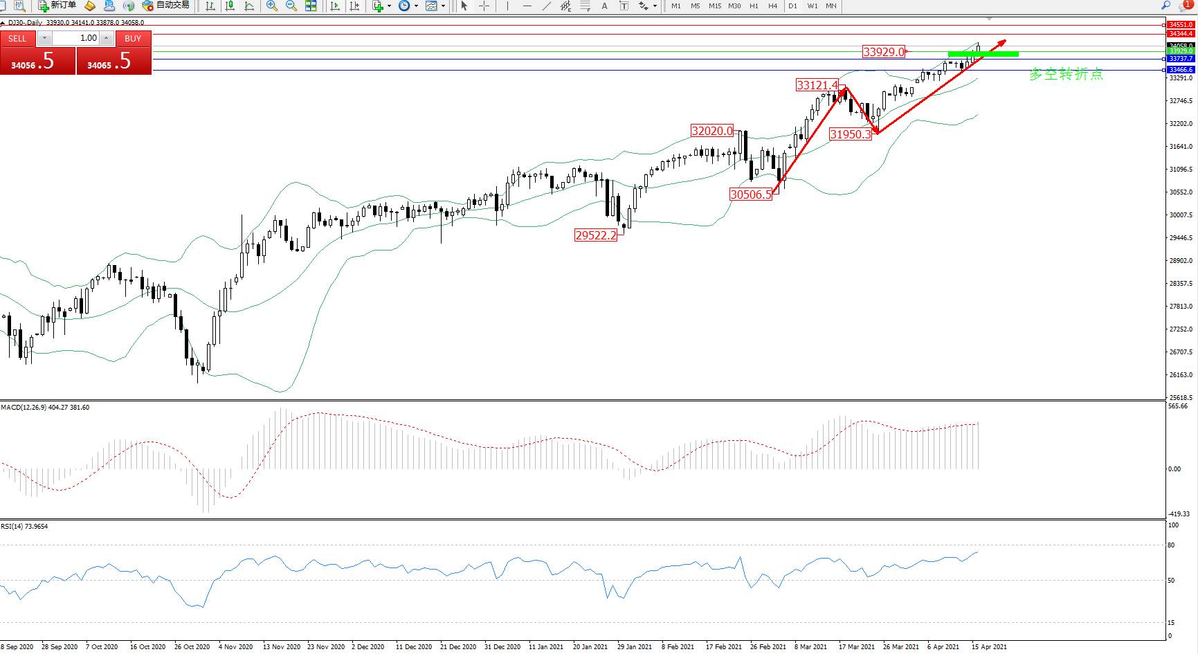 道琼斯指数4月16日(周五)收盘上涨166.00点,涨幅0.49%,报34201.99点;美股收盘,道指续刷新高,美国股市本周收于纪录高点,因中国经济数据进一步佐证了全球经济复苏迹象。强劲的亚洲和美国经济数据提振了市场人气。摩根士丹利成为了最新一家公布第一季度业绩创纪录的美资银行。近期还有不少数据令人印象深刻,表明美国经济正在复苏。在大范围的疫苗接种、财政刺激以及宽松货币政策的推动下,经济加快了增长脚步。不过美债收益率下行,表明投资者认为低利率会持续更长一段时间。美国经济距离实现美联储2%的通胀和充分就业目标还有很长的路要走,这些目标是美联储开始考虑减少对经济支持的门槛。这呼应了美联储主席鲍威尔在过去一周几次讲话中的言论。鲍威尔表示,在劳动力市场持续存在闲置的情况下,政策制定者将容忍短期物价上涨。