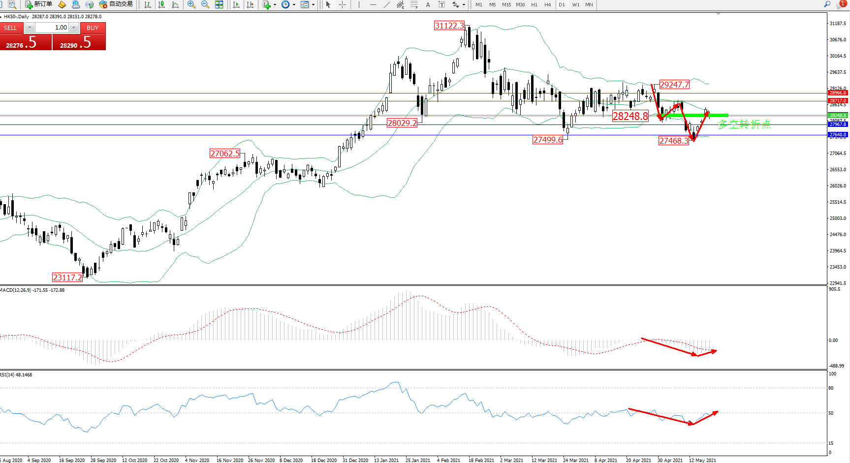 技术点评:空头动力延续布林带指标通道中下轨区间呈阶梯式震荡下行,低位抵达27468位置后得到短暂支撑反转上移,多头动力有伺机入场态势,布林带指标呈张口走势后开始缓慢收口,MACD指标处于0轴线下方空头区域弱势整理徘徊,RSI指标处于空头区域维持窄幅整理回升50均衡线下方;
