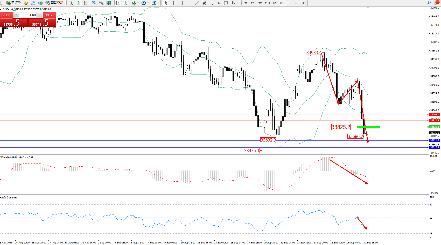 交易策略:33825下方看跌,目标33621、33517