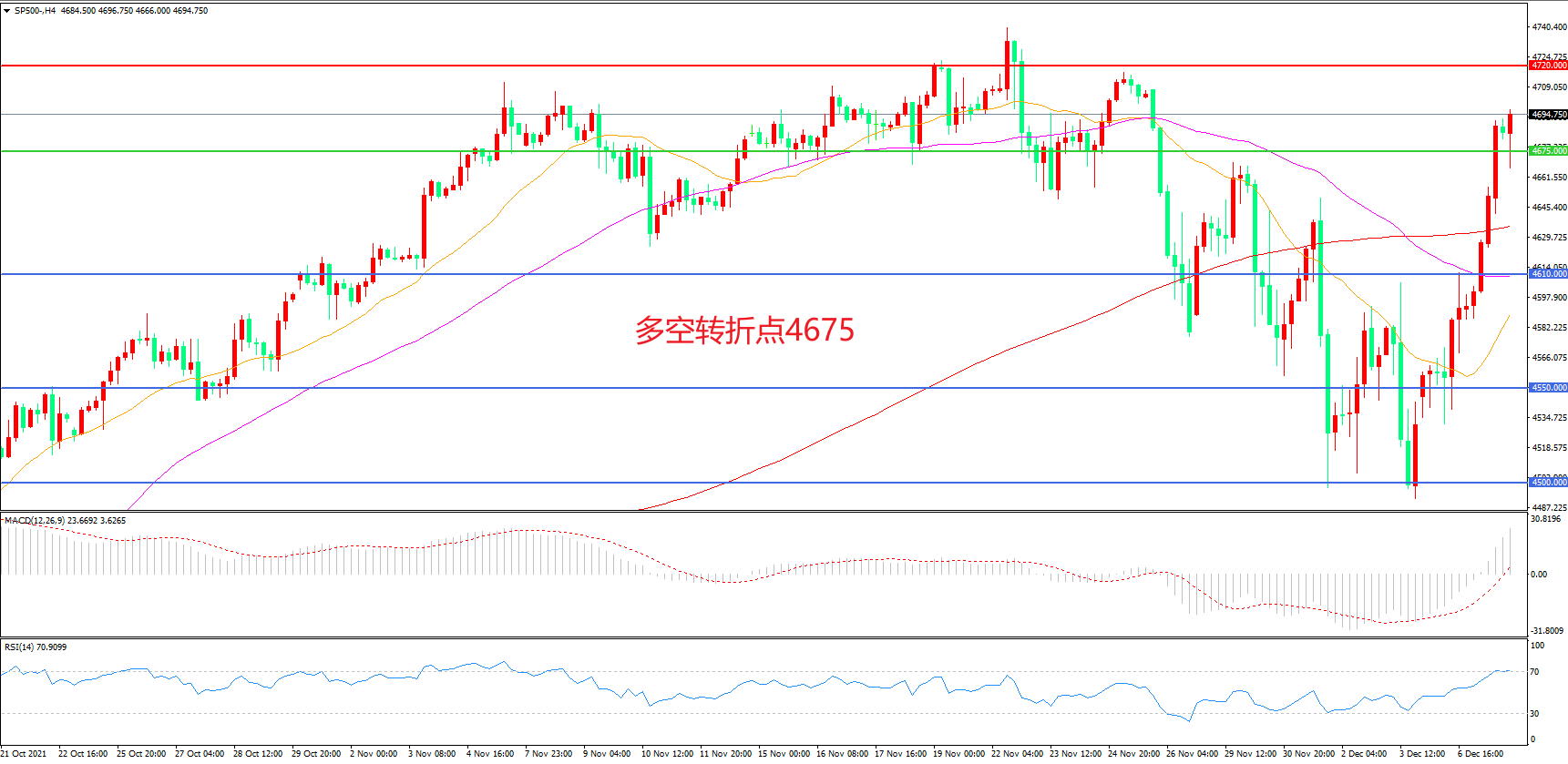 4小时图看,标普500长阳连续拉升,短期走势偏强,200周期均线成为下方支撑,4675成为多空分水岭,MACD红柱增加,RSI指标走平,日内震荡上行概率较大。