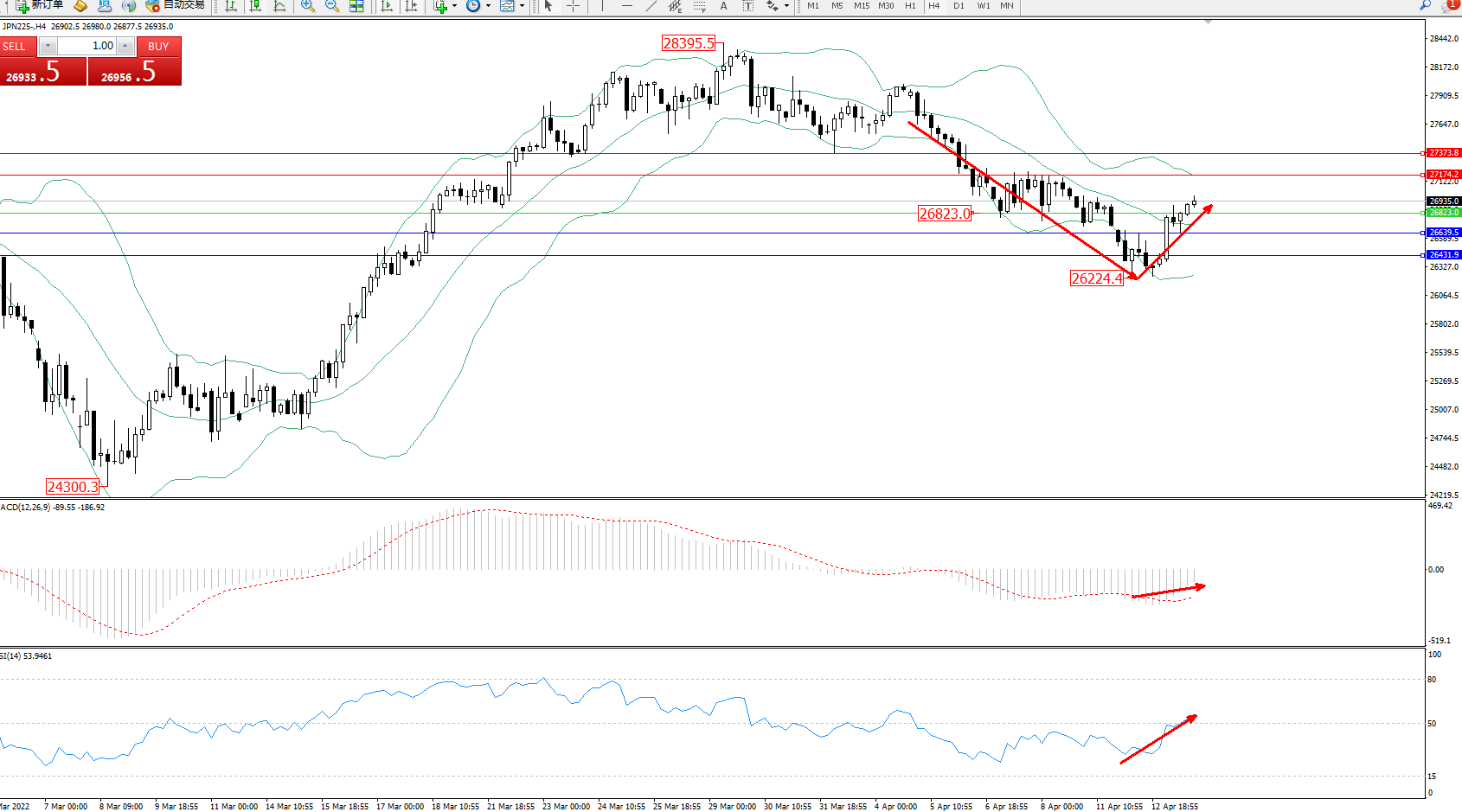 技术点评:空头动力延续布林带指标通道中下轨区间持续震荡下行,低位抵达26224附近节点后开始震荡上移,低位多头动力伺机入场,强势上移至中上轨区间窄幅震荡,多头动力有继续回升迹象,布林带指标呈收口走势持续中,MACD指标处于空头区域维持震荡上移中,RSI指标处于空头区域维持震荡上移至50均衡线上側徘徊中;