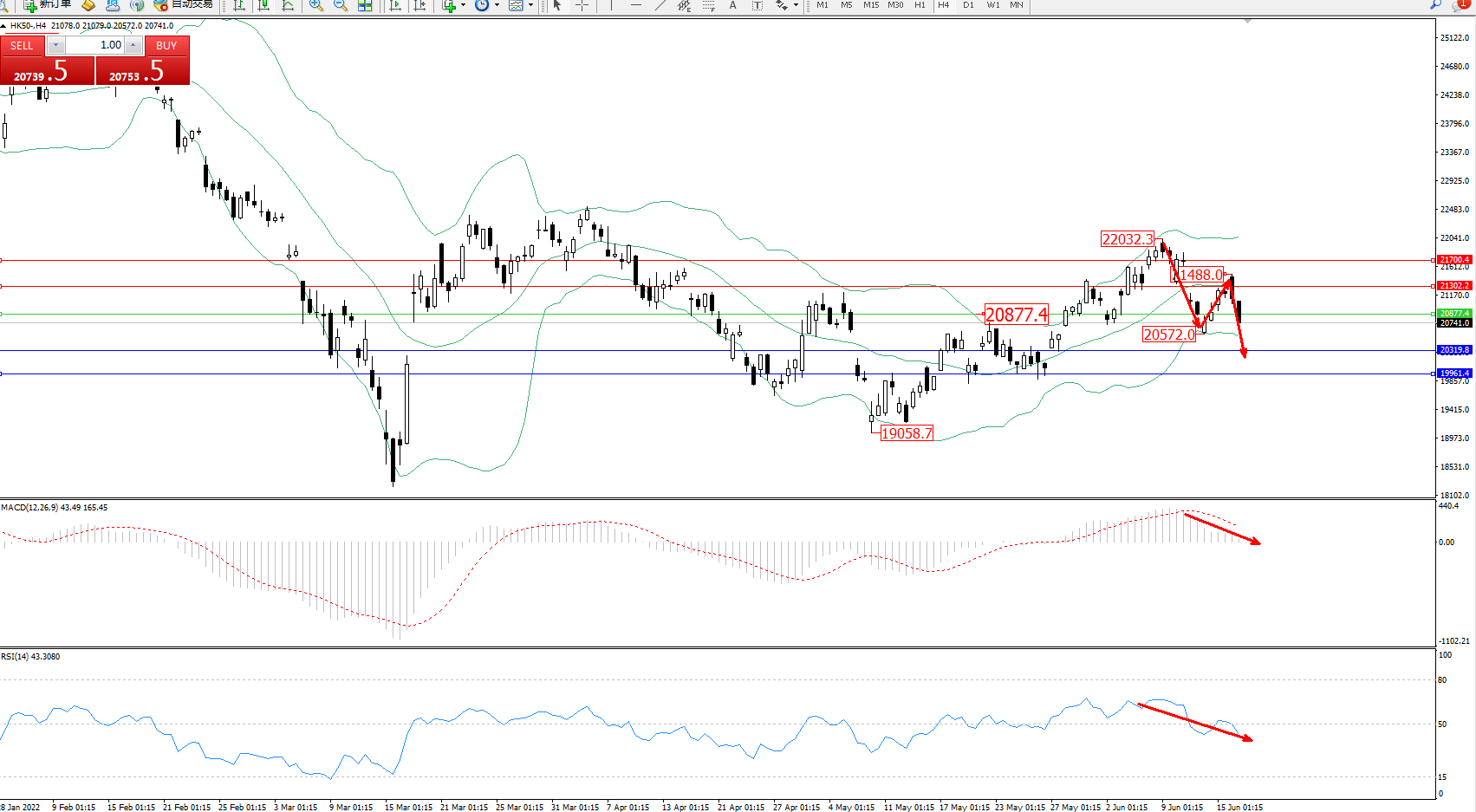 香港恒生指数6月16日(周四)收盘下跌462.78点,跌幅2.17%,报20845.43点;港股高开低走,尾盘三大指数跌幅进一步扩大。恒生科技指数跌3.33%跌破4600点。大型科技股全线下挫,快手跌近9%,网易跌超5%,美团超约4%,阿里巴巴、腾讯皆下跌;在线教育股在弱势行情中继续狂飙,新东方在线盘中飙升100%,一度重回30港元上方,带动天立教育、光正教育等大幅拉升。