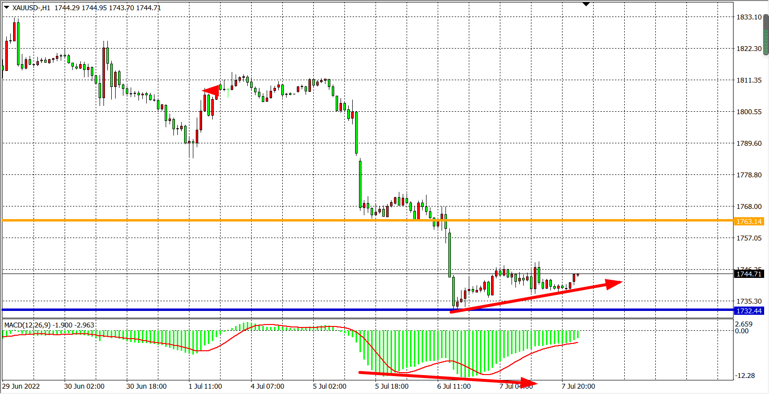 1小时图看,金价在回落1732后出现止跌反弹,MACD量能持续放大但价格未创新高,形成底背离信号,预示短期行情进入超卖,存反弹修复需求,日内看箱体盘整为主,下方1732美元,上方1763美元。