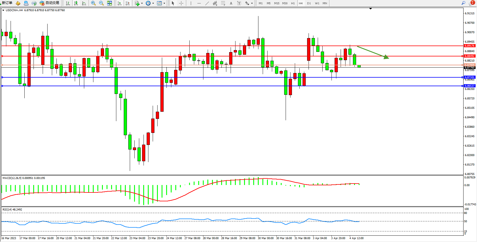 4小时图看:高位短期震荡,市场空头情绪开始有回撤迹象,MACD指标处于0轴线附近弱势徘徊,RSI指标处于50均衡线附近弱势整理;