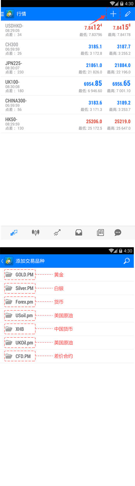 3.点击页面的右上角【+】进入到新订单窗口。点击您可选择交易商品,点击您可切换订单类型。