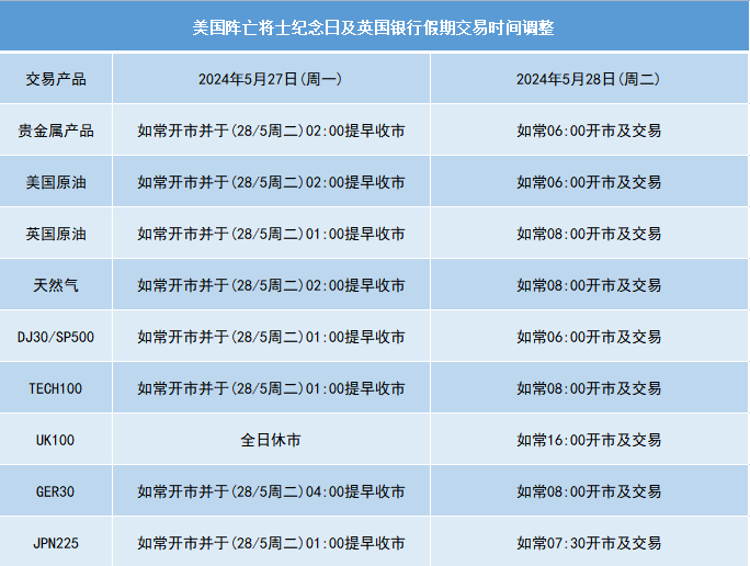 因应2024年5月27日(周一)为美国假期及英国银行假期关系,本公司以下产品的交易时间将于假期期间作以下安排,敬请留意。