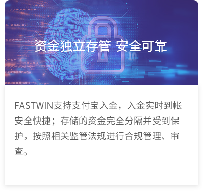 FASTWIN支持银联转账入金,入金实时到账安全快捷;存储的资金完全分隔并受到保护,按照相关监管法规进行合规管理、审查。